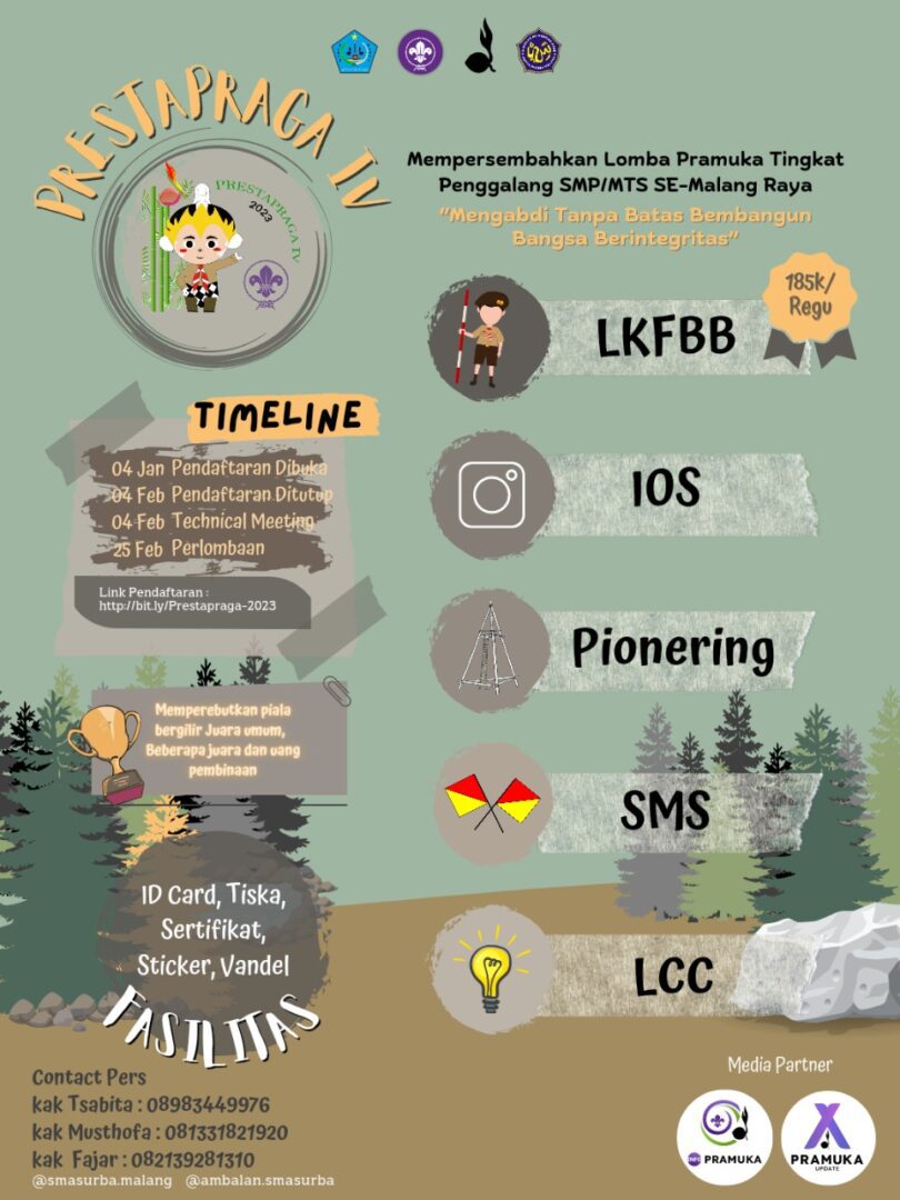 ⚜️⚜️ AMBALAN SMA Islam Surya Buana Malang PROUDLY PRESENT ⚜️⚜️ “PRESTASI TANGGAP PRAMUKA PENGGALANG IV (PRESTAPRAGA IV)” 🌏Tingkat SMP/MTS Se-Malang Raya ⭐ MATA LOMBA ⭐ ✔ Lomba Kreasi Formasi Baris Berbaris ✔ Instagram of Scout ✔ Pionering ✔ SMS ✔ Cerdas Cermat SAVE THE DATE 📆 Hari/Tanggal : Sabtu, 25 Februari 2023 ⏰ Waktu : 06.00 WIB-Selesai 🏟 Tempat : SMA Islam Surya Buana Malang FASILITAS / BENEFIT : • Sertifikat Peserta dan Pembina • Stiker kegiatan • ID Card • Tiska • Vandel penghargaan untuk masing-masing sekolah • Trophy Tetap dan Bergilir • Uang Pembinaan PENDAFTARAN https://bit.ly/Prestapraga-2023 PETUNJUK PELAKSANA https://drive.google.com/file/d/1XauFfSq7qcXNix41WVyfPntul8g3pVOG/view?usp=share_link Contact Person 👉 Kak Tsabita Wa/08983449976 👉 Kak Fajar Wa/082139281310 Tunggu Apa Lagi…?? Segera Daftar KUOTA TERBATAS!!! Follow Our Social Media Instagram: @ambalan.smasurba Web : www.smasuryabuana.sch.id prestapragaIV#prestapraga2022#pramukaindonesia#ambalansmasurba#smasurba