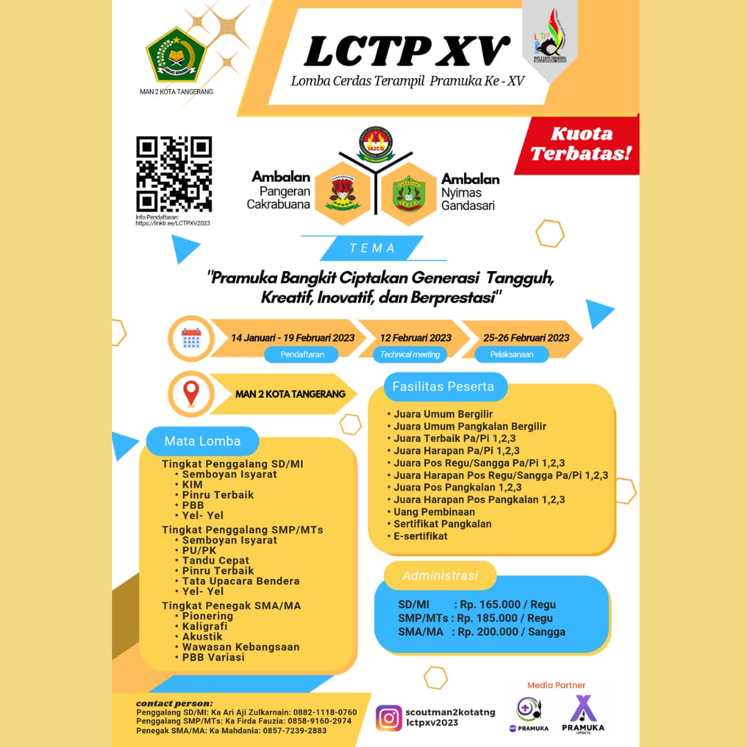 Bagikan Konten Kami ⚜️AMBALAN CAKRABUANA-GANDASARI⚜️《Lomba Cerdas Terampil Pramuka | LCTP XV 2023》Se-JabodetabekTingkat SD, SMP & SMA“Pramuka Bangkit Ciptakan Generasi Tangguh, Kreatif, Inovatif dan Berprestasi》EVENT WILL BE HELD ON《🗓 25-26 Februari 2023📍 MAN 2 Kota Tangerang》🎟 PENDAFTARAN 🎟《🗓 14 Januari- 19 Februari 2023》TECHNICAL MEETING《🗓 12 Februari 2023◇◇◇◇◇◇◇◇◇◇◇◇◇◇》☆ MATA LOMBA ☆《🔴 Penggalang SD/MI :• Semboyan Isyarat• KIM• Pinru Terbaik• PBB• Yel-Yel🔴 Penggalang SMP/MTs• Semboyan Isyarat• PU/PK• Tandu Cepat• Pinru Terbaik• Tata Upacara Bendera• Yel-Yel🟡 Penegak SMA/MA• Pionering• Kalografi• Akustik• Wawasan Kebangsaan• PBB Variasi▪︎▪︎▪︎▪︎▪︎▪︎▪︎▪︎▪︎▪︎▪︎▪︎》☆ MEMPEREBUTKAN HADIAH ☆《🏆 Juara Umum Bergilir🏆 Juara Umum Pangkalan Bergilir🏆 Juara Terbaik Pa/Pi 1,2,3🏆 Juara Terbaik Harapan Pa/Pi 1,2,3🏆 Juara Pos Regu/Sangga Pa/Pi 1,2,3🏆 Juara Harapan Pos Regu/Sangga Pa/Pi 1,2,3🏆Juara Pos Pangkalan 1,2,3🏆 Juara Harapan Pos Pangkalan 1,2,3》FASILITAS《💰 Uang Pembinaan📄 Sertifikat Pangkalan📼 E-sertifikat°•°•°•°•°•°•°•°•°•°•°•°•°•°•°•》🎫 BIAYA PENDAFTARAN 🎫《SD/MI. : Rp 165.000 / ReguSMP/ MTs. : Rp 185.000 / ReguSMA/MA. : Rp 200.000 / Sangga》☎️ NARAHUBUNG ☎️《SD. : Kak Ari Aji Zulkarnain (0882-1118-0760)SMP/MTs. : Kak Firda Fauzia (0858-9160-2974)SMA/MA. : Kak Mahdania (0857-7239-2883)🔎 Find US On 🔍@scoutman2kotatng@lctpxv🥂 Media Partner 🥂@pramukaupdate@infopramuka AdvertisementsYuk gabung Whatsapp Channel kami! Follow kami di Telegram! & Instagram Bagikan Konten Kami